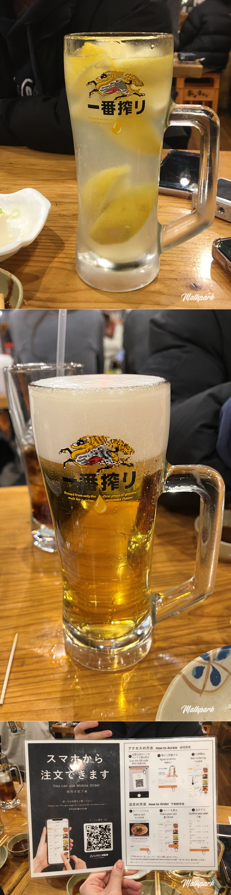 최강사와 473円, 생맥주 385円. 테이블마다 특히 여성분들이 대부분 사와를 마시고 있어서 주문해 봤는데 왜 그런지 충분히 납득이 되는 맛입니다. QR 코드를 이용해 메뉴를 골라 직원을 부르지 않고 바로 주문할 수 있는 점도 편리합니다.