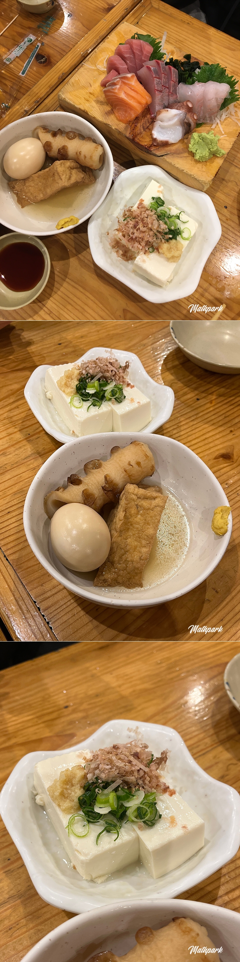 오뎅 3종 모둠 352円, 두부 187円.